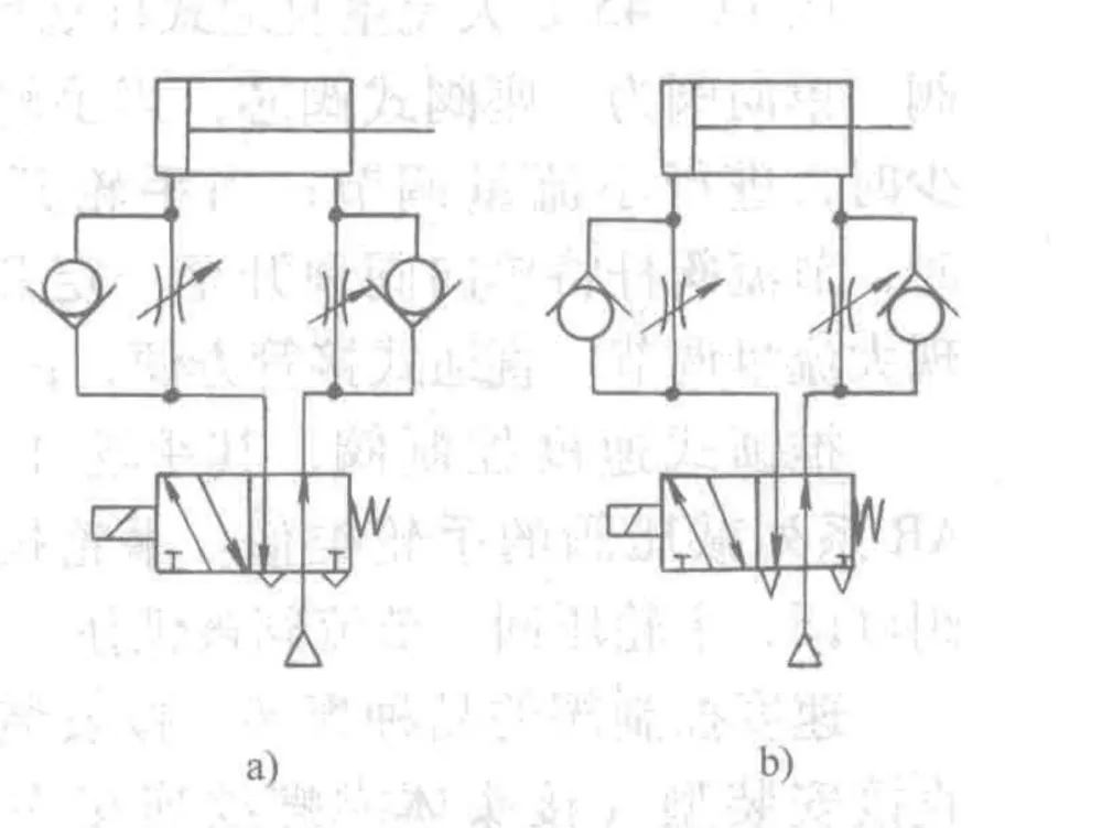 · (a) (egzoz kısma) sırasında yön valfine enerji verildiğinde silindirin giriş tarafındaki çek valf açılarak milsiz tarafın hızla dolmasını sağlar. Çubuk tarafındaki hava yalnızca gaz kelebeği yoluyla dışarı çıkabilir. Gaz kelebeği açıklığını ayarlayarak silindir hızı kontrol edilebilir. Bu yöntem stabil piston hareketi sağlar ve en sık kullanılan devredir.