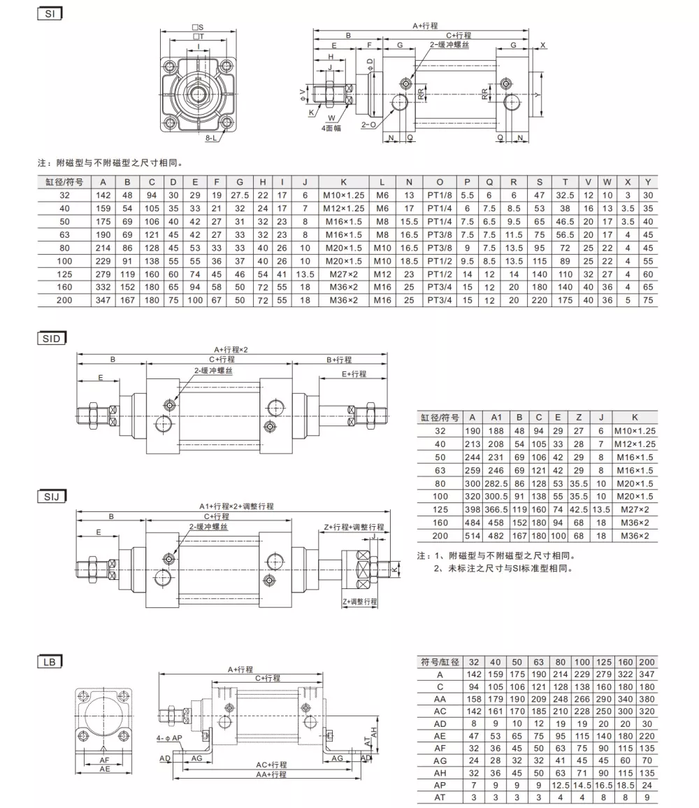 SI serisi ISO15552 standart pnömatik silindirler üç tipte mevcuttur: standart çift etkili, SID çift çubuklu çift etkili ve ayarlanabilir stroklu SIJ çift çubuklu çift etkili. ISO 15552 standardına uygundurlar, yani montaj boyutları daha büyüktür.SU pnömatik silindirleraynı boyutta. Sabit aksesuarlar birbirinin yerine kullanılamaz ve yalnızca ISO 15552 (eski adıyla ISO 6431) spesifikasyonlarıyla uyumludur.